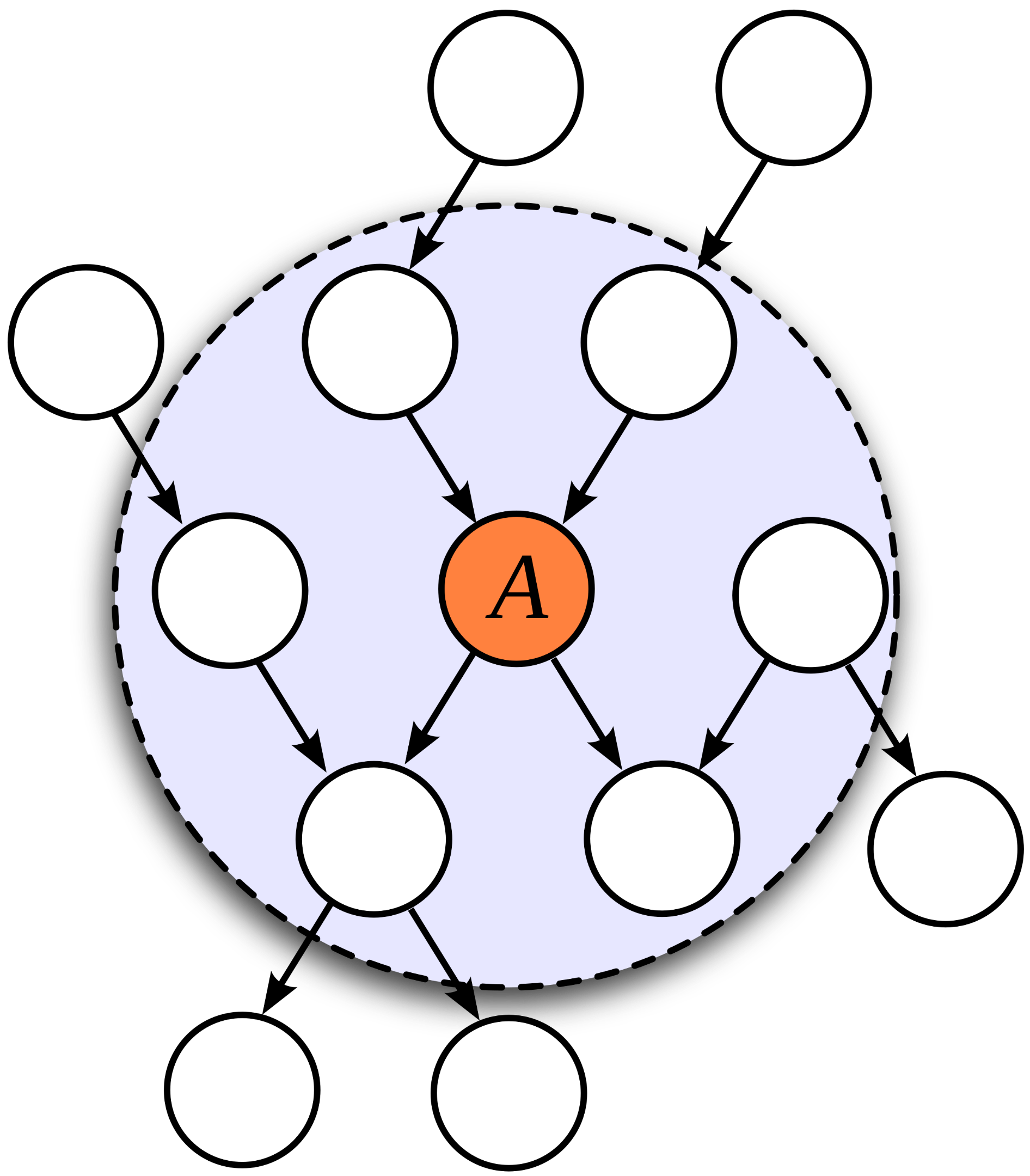 In a Bayesian Network, the Markov blanket of a node has a pleasantly concrete shape: the node’s parents, its children, and the other parents of its children (often called its “spouses”). Condition on those, and the rest of the network stops mattering for predicting that node.